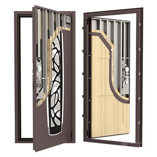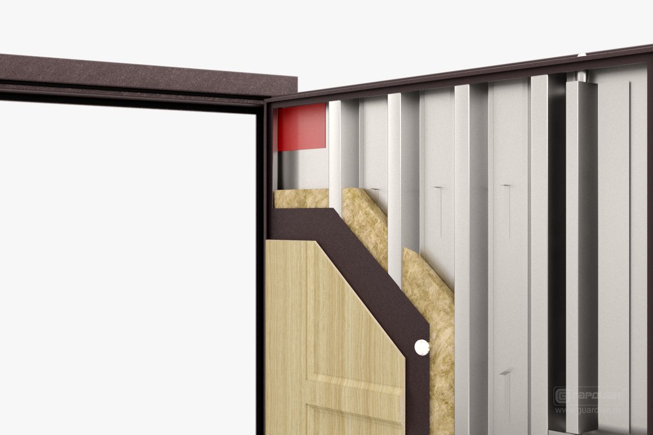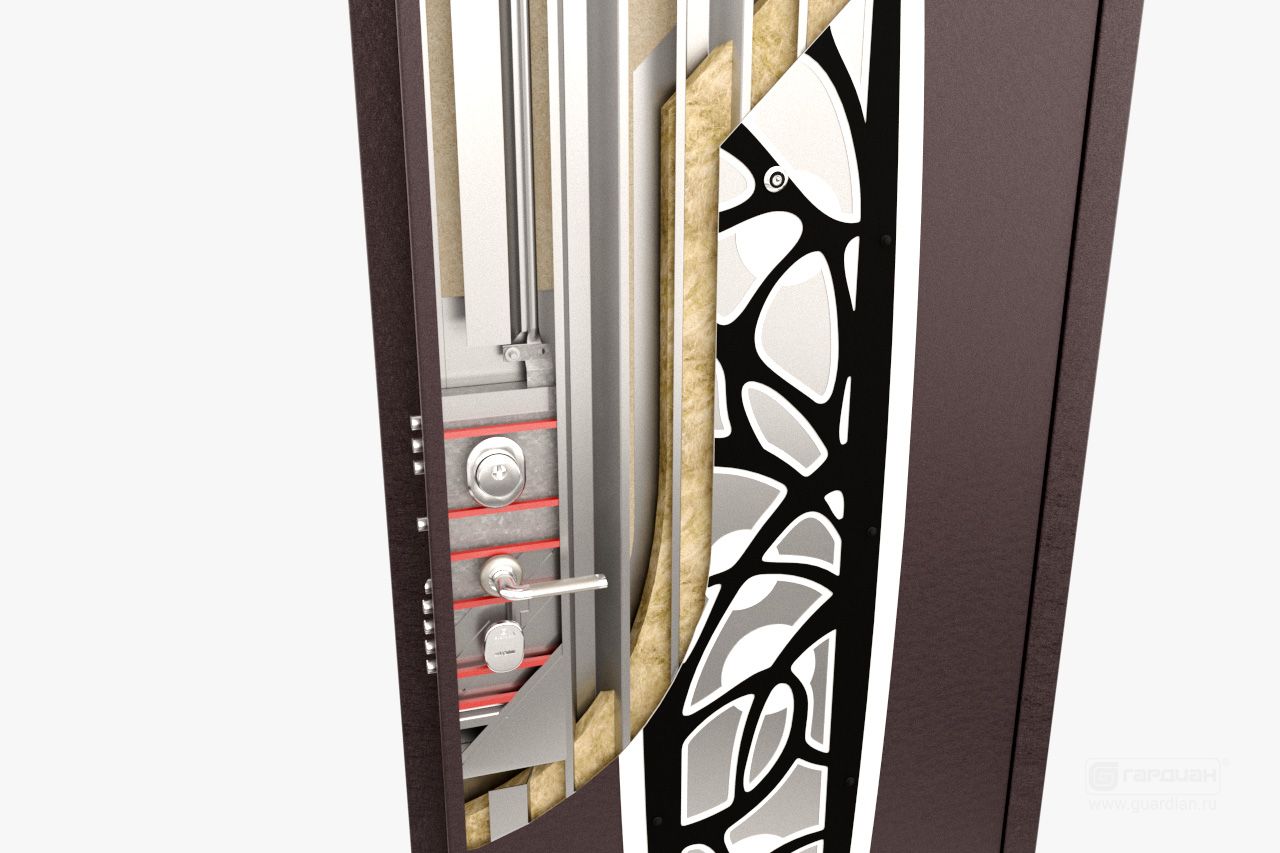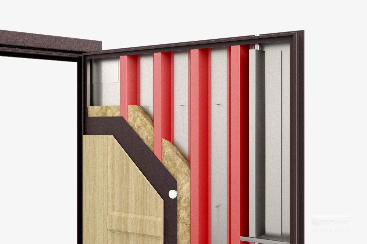 Конструкция из 4 вертикальных профилей (по форме «Трапеция») по всей высоте дверного полотна для увеличения устойчивости двери к деформации и вспарыванию при силовом взломе и взломе разрушающим методом.